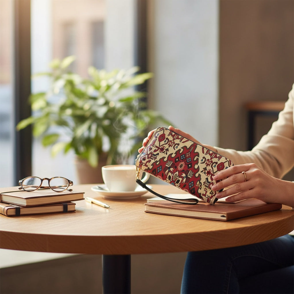 This beautiful compact wallet showcases an intricate motif inspired by traditional Persian or Oriental rugs, but set against a luminous ivory background. The rich, sophisticated colors—deep reds, slate blues, and berry tones—create a unique, elegant accessory perfect for adding a touch of global artistry to your everyday carry.